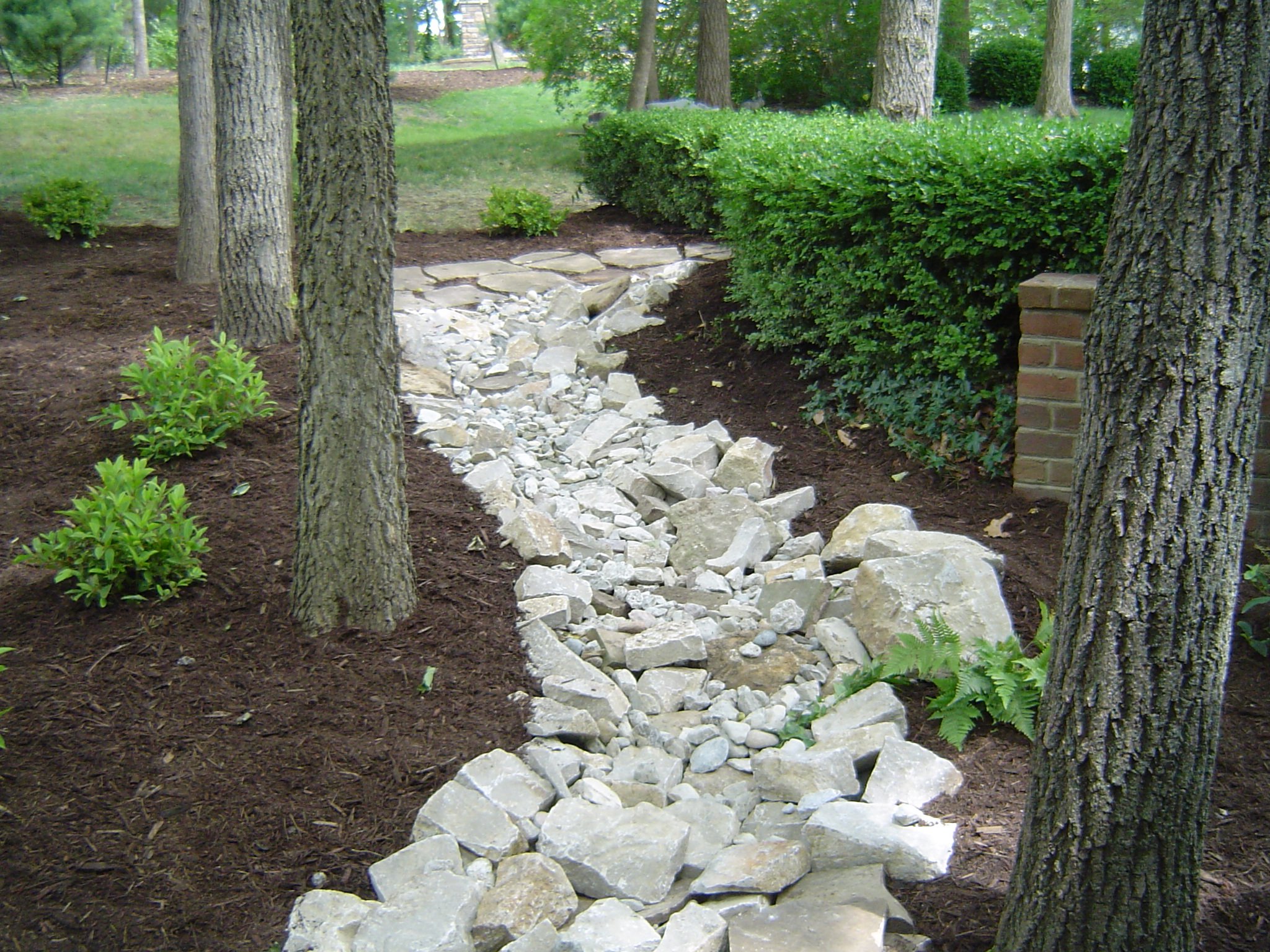 Beyond their practical role in stormwater management, dry creek beds serve as elegant, low-maintenance design elements that add depth, texture, and movement to the landscape. We carefully shape them to blend seamlessly with surrounding features—whether curving through mulch beds and rock features, framing paver patios, or accentuating retaining walls—creating natural pathways for water that double as focal points year-round. When paired with native plants along the edges, they support pollinators, reduce mowing needs, and enhance curb appeal, all while requiring minimal upkeep once established. If a project calls for advanced grading or integration with larger drainage systems, we collaborate with trusted local contractors to ensure the dry creek bed performs flawlessly and complements the overall vision for your perfect yard